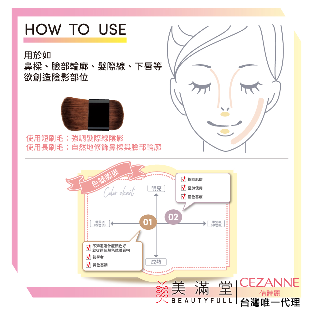 使用方式:用於如鼻樑、臉部輪廓、髮際線、下唇等欲創造陰影部位。