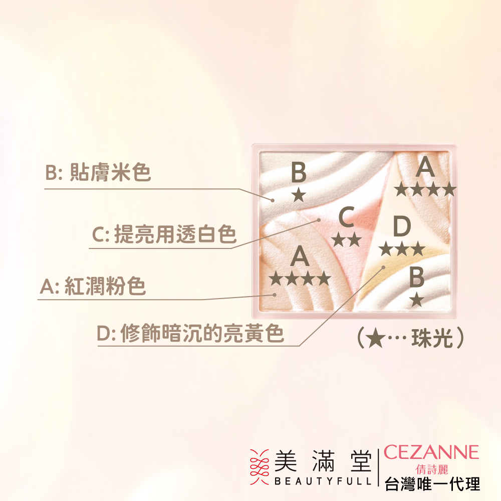 三種霧面色 + 一種珍珠粒子光色,依據想要呈現的妝感選用不同色塊,珠光色也能做為打亮修容用。