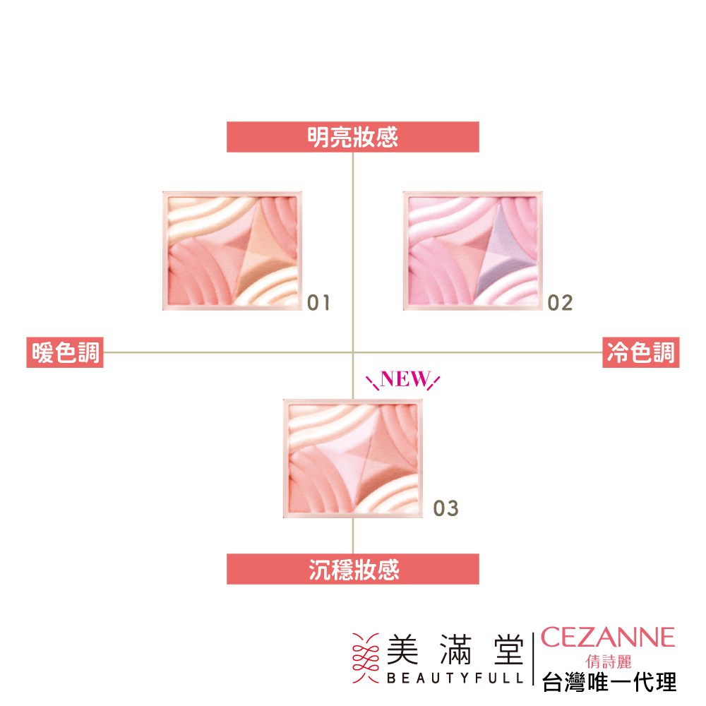 02 甜美粉:可愛的水彩粉、嬰兒粉、透明粉紅打亮色、冷薰衣草色,透明的粉紅色調創造柔和甜美妝感。