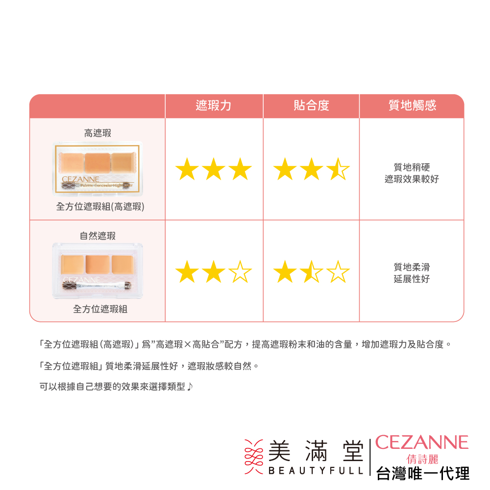 本賣場另有販售 CEZANNE 全方位遮瑕組 - 高遮瑕,下方為兩種版本的比較表,可依自己的需求做選擇。