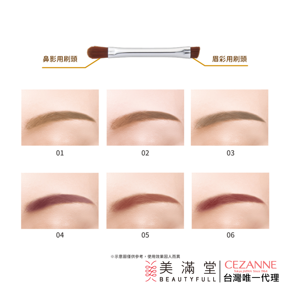 刷毛頭沾滿中區粉末刷在眉的中央,再用刷毛頭沾滿右區自眉中央刷往眉尾,泡棉刷頭沾取左區粉末刷在眉頭,再刷往鼻翼。