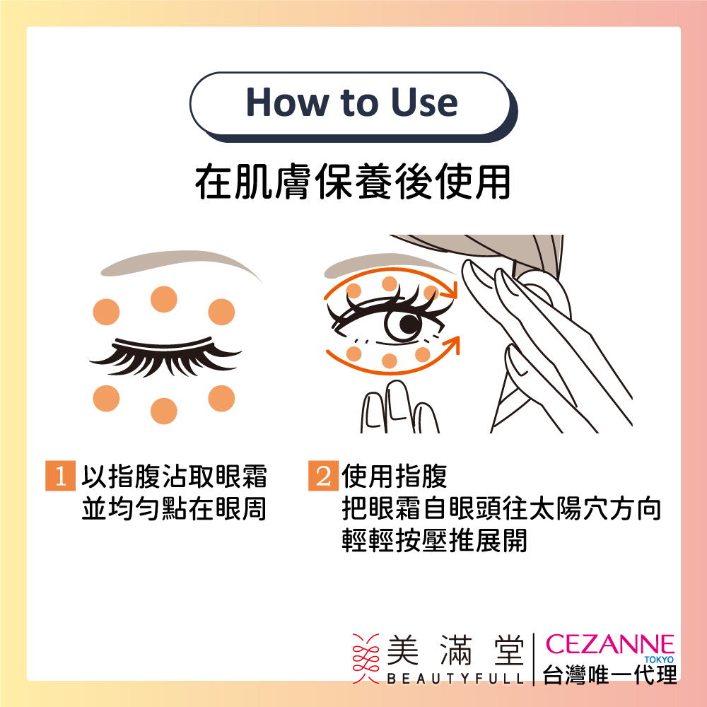 使用方式:在肌膚保養後使用,以指腹將眼霜均勻點在眼睛四周,再用指腹把眼霜自眼頭往太陽穴方向輕輕按壓推展開。